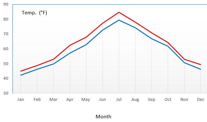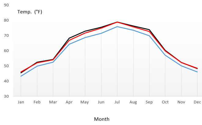 Above is data from 1979. It compares the average maximum daily temperature, averaged over each month, for ground which had been burnt over three times (red line), compared with ground which had no treatment (blue line). A consistent elevation of temperature is observed, with the difference increasing towards mid-summer.